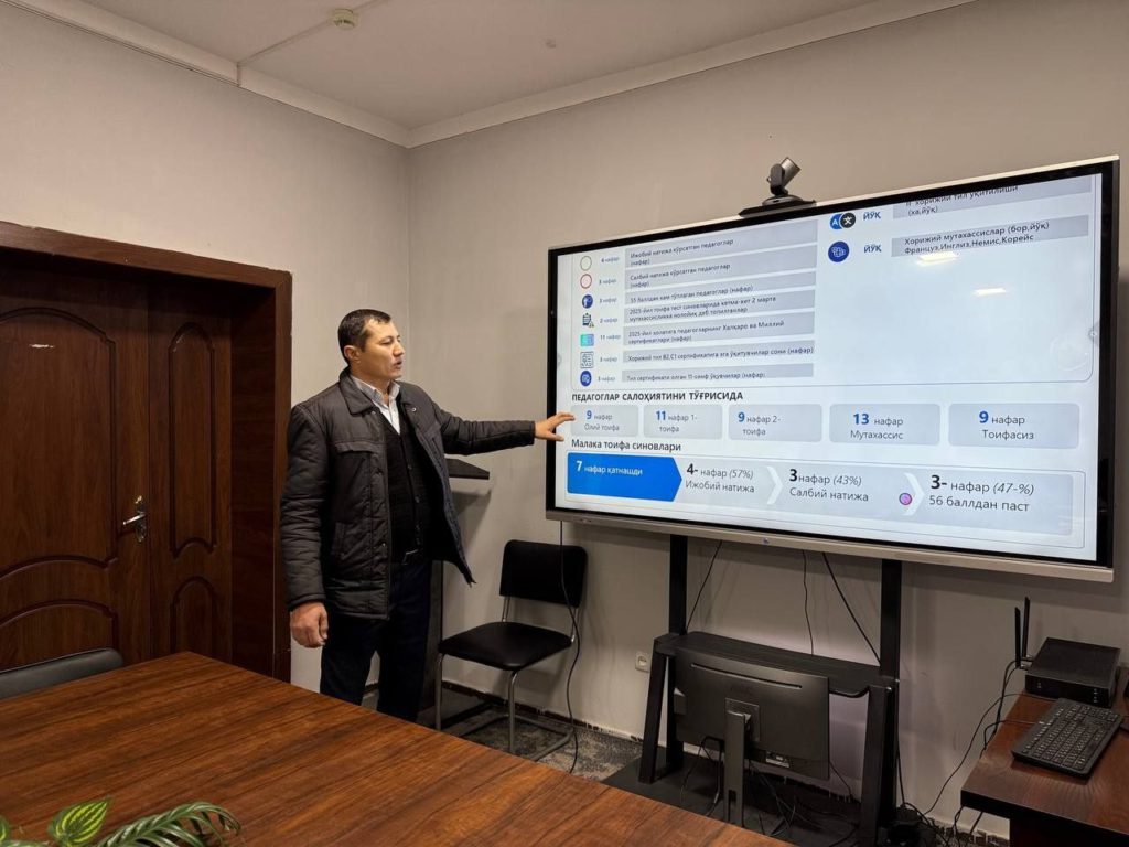 Sirdaryo viloyati Maktabgacha va maktab ta’limi boshqarmasi boshlig’i N.Xolbayeva tomonidan Xovos tumanidagi ta’lim muassasalari rahbarlarining 2025-yil davomida erishgan yutuqlari hamda istiqbolli rejalariga oid taqdimotlari batafsil tahlil qilinmoqda.